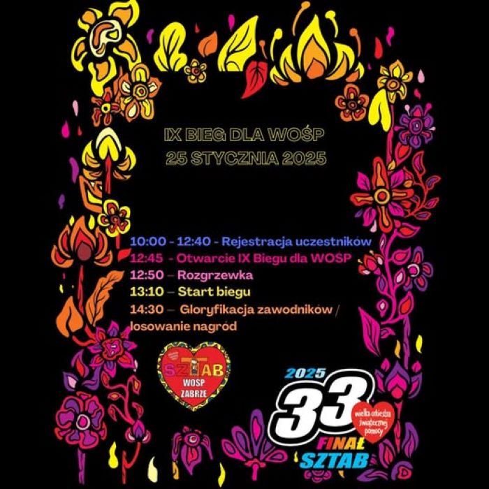 Jeszcze przed Finałem w sobotę 25 stycznia odbędzie się IX Zabrzański Bieg Orkiestrowy - "Bieg dla WOŚP". Zadaniem uczestników będzie pokonanie trasy na dystansie 3 oraz 6 km w formie biegu lub nordic walking.