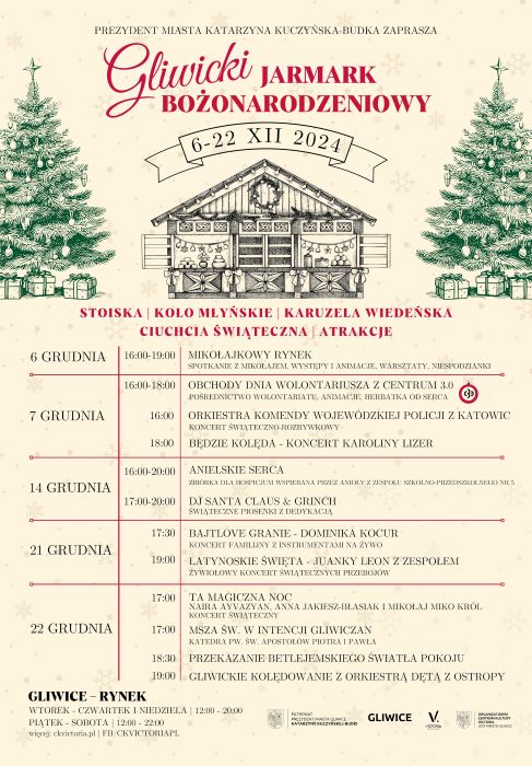 Już 6 grudnia Rynek w Gliwicach zamieni się w magiczną krainę ozdobioną świątecznymi iluminacjami i pięknymi dekoracjami. Wokół ratusza znajdziemy kramiki oferujące przysmaki kojarzące się ze świętami Bożego Narodzenia, takie jak pierniki, gorąca czekolada, czy napoje z dodatkiem aromatycznych korzennych przypraw. Nie tylko stragany oferujące gastronomię będą mogły pochwalić się bogatym asortymentem. Na jarmarku znajdziemy także specjalne kramiki „Made in Gliwice”, gdzie lokalni artyści zaprezentują liczne wyroby rękodzielnicze.