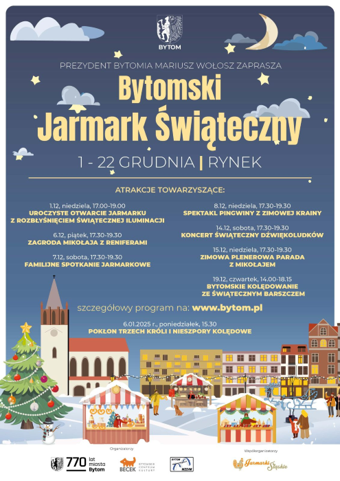 – Bytomski Jarmark Świąteczny zwieńczy obchody 770-lecia naszego miasta, dlatego zależy nam, aby to wydarzenie było wyjątkowe, tak jak wyjątkowy jest okrągły jubileusz lokacji miasta – mówi prezydent Mariusz Wołosz. Program jarmarku będzie obfitował w wiele niespodzianek. Już 1 grudnia o godz. 17.00, wspólnie uruchomimy oświetlenie świąteczne i otworzymy Jarmark Świąteczny na Rynku, który na prawie na trzy tygodnie zamieni się w bożonarodzeniową wioskę pełną atrakcji dla każdego – zachęca prezydent.
